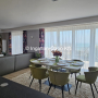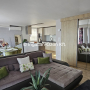 A másik lakosztály, a felső két szint összesen 90 m2 + 48 m2 erkély. Az emeleten 3 hálószoba, fürdőszoba, az alsó szinten amerikai konyhás nappali kapott helyet. Az lakrész teljes bútorozása és berendezése a vételár részét képezi.