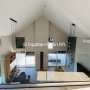 A hálószobák (2db) viszont nem pont ezen a szinten vannak, mert ide fel kell menni egy fél szintet, mintegy virtuálisan is elválasztva a lakóteret a hálószobáktól. Mindkét hálószoba saját fürdőszobával szolgálja az itt lakók kényelmét.