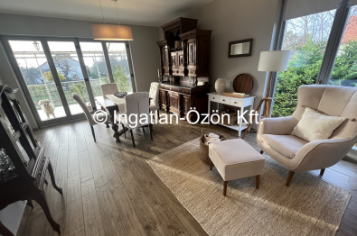 A nappali tágas, 31m2 -es + amerikai konyha, ablakai Pilisborosjenő, Üröm hegyeire panorámásak. A nappaliban beépítésre került még egy fatüzelésű kandalló is....