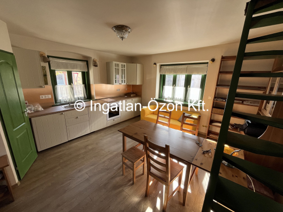 Elrendezés: Alsó szinten 21 m2-en amerikai konyha, nappali és kis wc-kézmosó. Az emeleten, amely bruttó 29,5 m2 (nettó 11 m2) hálószoba, és fürdőszoba.